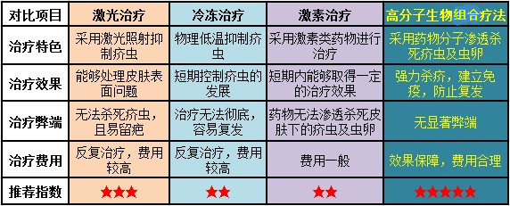 1、疗程短、见效快:在使用高分子生物组合疗法当天搔痒明显减轻,3天身上丘疹消失,结节明显变小,5到10天基本祛除疥疮, 1到2个疗程即可治愈疥疮、疥疮结节,临床应用后深受业内和患者好评。