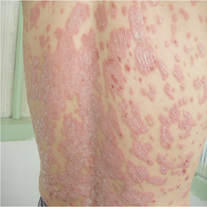 3、一些岁数较大的中老年病人,经常是因遇到某些负性事件。突然头皮局部或身上某局部出现点滴状斑块状的红疙瘩,边界清楚,自觉瘙痒。随后皮损渐渐在局部扩大或泛发全身,同时可见红疙瘩上面覆盖着的鳞屑也越来越多、越厚。这类病人的皮损大多数初始是以寻常型、点滴状为主,而后变成斑块状,也有初始即为斑块状者。
